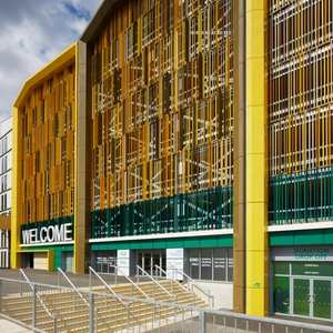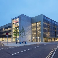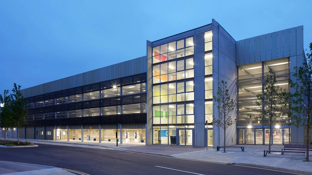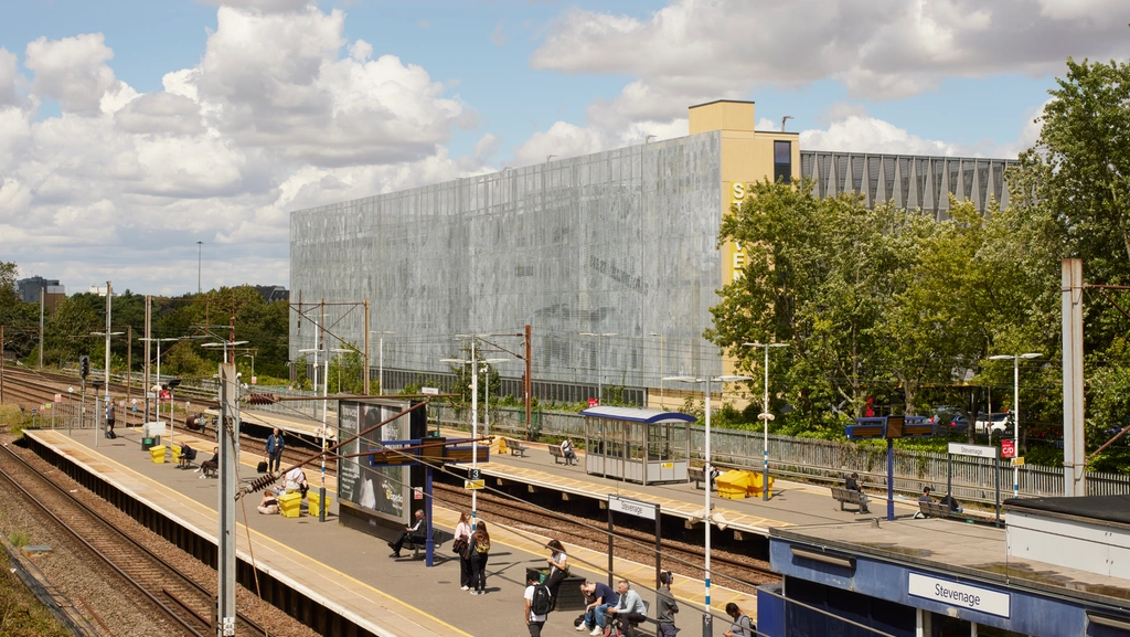 A new multi-storey car park and transport hub in central Stevenage, expanding capacity during town centre regeneration and featuring façades celebrating the town’s scientific heritage and community spirit.